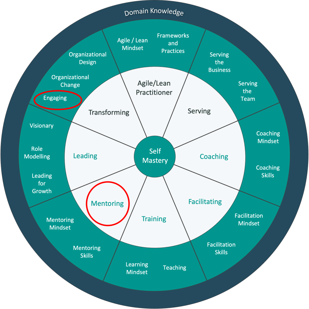 One proposal that emerged was the idea of bringing Mentoring up to the top level and moving partnering (which we renamed engaging) to the transforming section, to represent how you enter an organisational setting. Mentoring is clearly a separate thing from training. This will need testing out with a wider group. Engaging is about how we enter the organisation, setting goals, growing relationships and creating structure around how the engagement will work.